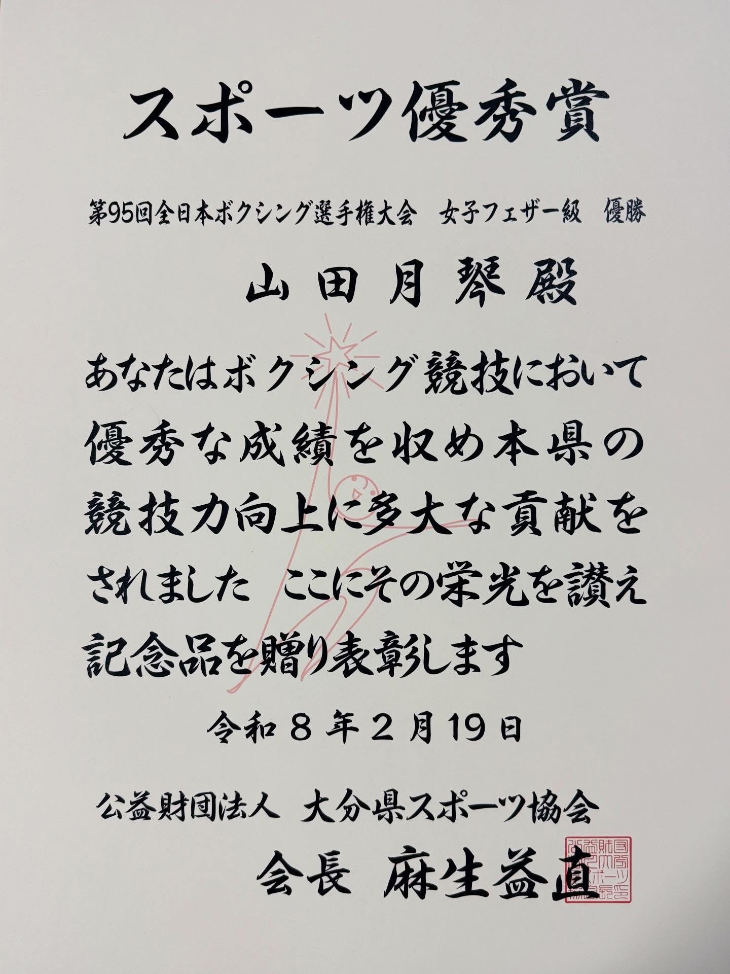 大分県スポーツ協会より上記結果の功績を評価されスポーツ優秀賞を表彰されました。